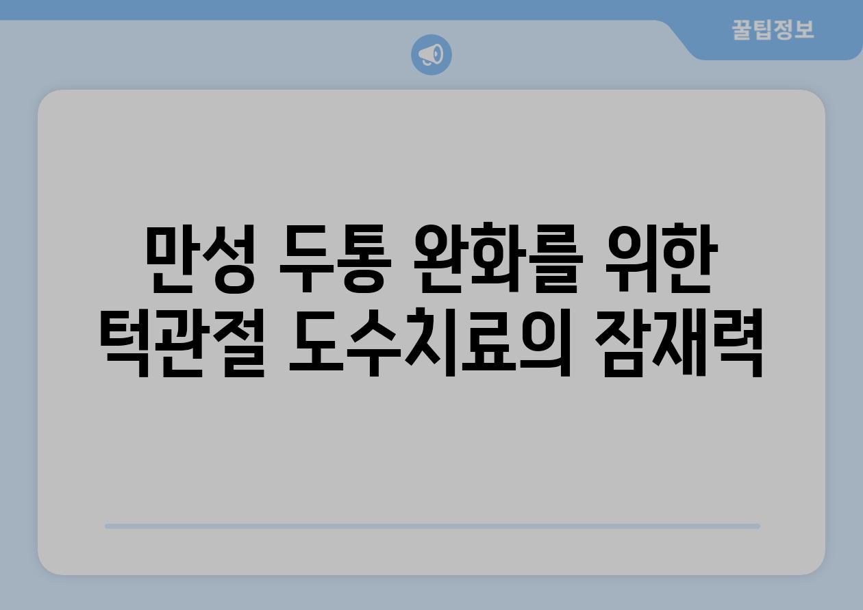 A 연구에 따르면 턱관절 도수치료가 만성 두통의 증상을 완화하는 데 도움이 될 수 있음이 밝혀졌습니다. 턱관절의 부정렬이나 긴장은 삼차 신경계 통로에 영향을 미쳐 두통을 유발할 수 있습니다. 턱관절 도수치료는 턱관절의 기능을 회복하고 이러한 부정렬 및 긴장을 해소하여 두통을 완화하는 데 도움이 될 수 있습니다.