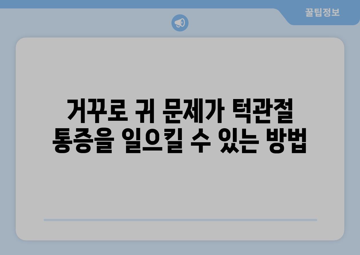 ## 거꾸로 귀 문제가 턱관절 통증을 일으킬 수 있는 방법 **구증** | **증상** | **원인** | **치료** ---|---|---|---| **이개관 협착** | 귀통, 턱 통증, 귀에서 윙윙 소리 | 이개관이 막혀 턱 운동에 제한이 생김 | 항히스타민제, 코르티코스테로이드, 수술 **공기 발산 관 막힘** | 귀통, 턱 통증, 턱 딸림 | 공기 발산 관이 막혀 턱 움직임에 지장을 줌 | 항히스타민제, 코르티코스테로이드, 수술 **중이염** | 귀통, 턱 통증, 열 | 귀 감염이 턱과 귀를 연결하는 신경에 압력을 줌 | 항생제, 귀 기관, 수술 **내이 장애** | 현기증, 귀통, 턱 통증 | 내이가 손상되어 턱 운동을 조절하는 신호에 영향을 미침 | 약물, 수술 **턱관절장애** | 턱 통증, 턱 딸림, 귀통 | 턱관절에 문제가 발생하여 귀를 연결하는 신경에 압력을 줌 | 물리 치료, 스플린트, 수술