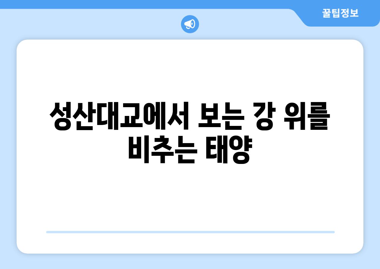 A 예, 성산대교는 한강 위에 걸쳐 있는 넓은 다리로 해돋이를 관람하기에 매우 좋은 장소입니다. 다리의 높이가 높아 장애물 없이 강 위를 비추는 태양을 감상할 수 있습니다.