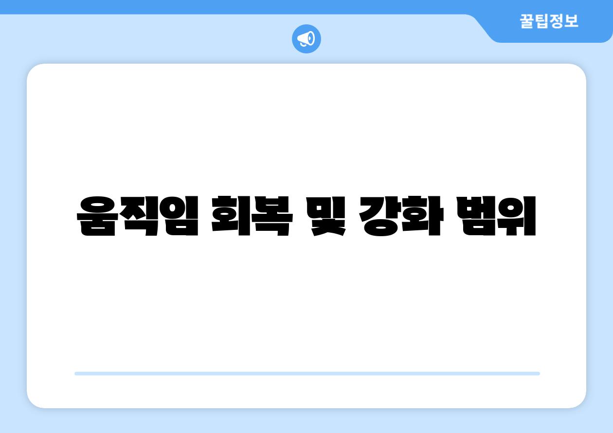 수술 후 움직임을 회복하여 관절 강성을 줄이고 근력을 강화하는 것이 중요합니다. 다음은 움직임 회복 및 강화 범위에 대한 지침입니다.